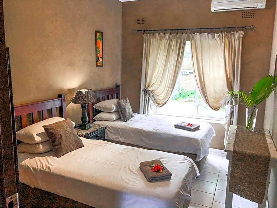 Unit Hluhluwe has an open plan layout with open bedrooms. This unit has a queen size double bed and 2 single beds with a large wooden deck, sea and forest views.